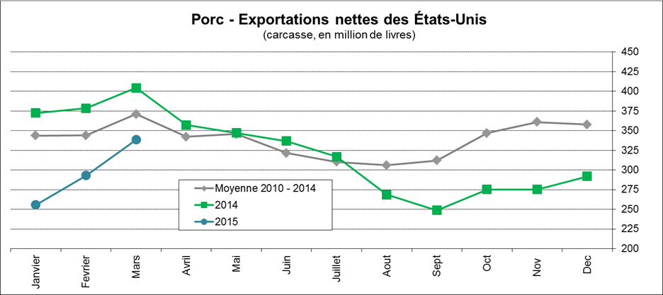 · En mars, les exportations nettes de porc étaient de retour en force à 339M lbs (-8.6% de la moyenne 5 ans)