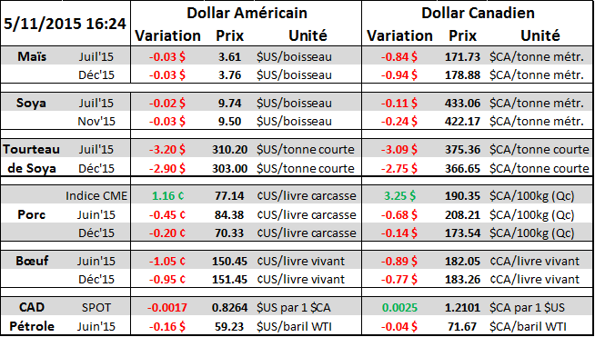 Demain midi, l’USDA publiera les premiers chiffres sur l’offre et la demande des cultures de 2015. En général, on s’attend à une diminution des inventaires de maïs ainsi qu’une augmentation dans le soya et blé, comparativement aux inventaires prévus au 31 août 2015 (tableau 1). Le marché a terminé la journée en légère baisse avec un faible volume transactionnel en attendant le rapport de demain. Les fortes livraisons à l’exportation annoncées ce matin n’ont pas supporté les prix. La semaine dernière, les exportations de maïs étaient de 1.13M tonnes et celles de soya à 263K tonnes, largement au-dessus des quantités requises pour atteindre la cible de l’USDA à 856K tonnes de maïs et 154K tonnes de soya par semaine jusqu’en septembre prochain. Seulement les livraisons de blé étaient plus faibles à 378K tonnes contrairement au 547K tonnes/semaine nécessaire (graphique 2).