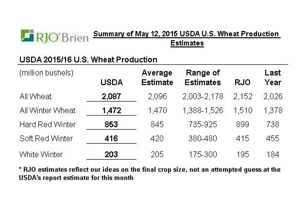 Pas de surprise sur l’ancienne récolte dans le sens ou les annulations d’exportation se reflètent dans le bilan. Le stock de fin est évalué à 709 millions de boisseaux et c’est légèrement plus que prévu. Ce qui nous intéresse particulièrement c’est la projection de la production des différents type de blé et les chiffres sont en ligne avec les prédictions des experts. La production 2015/16 de tous les types de blé est de 2.087 milliard de boisseaux, c’est légèrement sous les attentes de 2.096