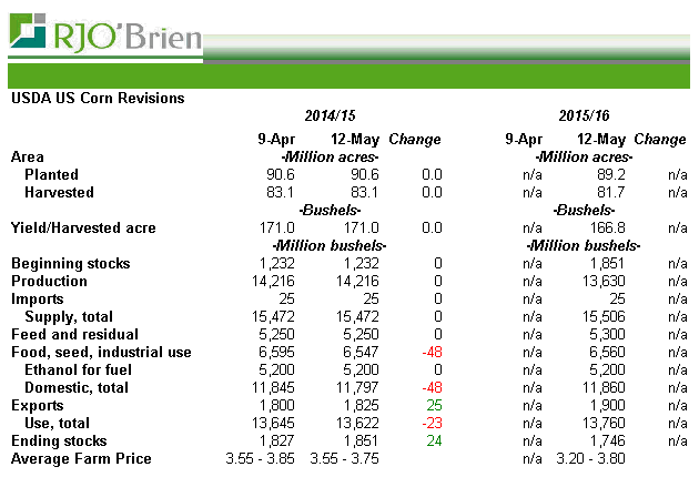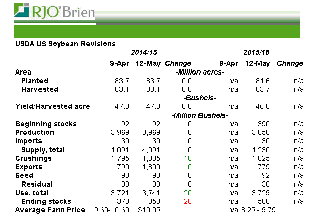 Donc nous avions à midi aujourd’hui le rapport offre-demande de l’USDA. Nous attendions ce rapport depuis quelques semaines pour bien évidemment se remettre à jour sur l’utilisation en cours, mais plus précisément pour obtenir les tous premiers chiffres du ministère de l’agriculture sur les inventaires de fin prévu pour la nouvelle récolte (2015/16). Nous allons explorer un peu plus en détails dans les lignes qui suivent, mais l’information la plus pertinente à mes yeux c’est l’ampleur des inventaires de soja pour la prochaine récolte. En fait, les prix de fermeture vendent la mèche dans le sens où le maïs et le blé sont quasi inchangé et le soja prend un coup de 18 cents.