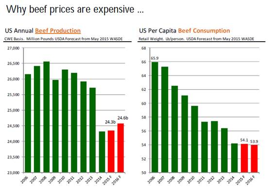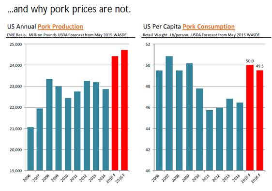 Voici donc en graphique pourquoi le prix du bœuf est aussi cher, alors que celui du porc est bon marché (Daily Livestock report - http://www.dailylivestockreport.com/documents/dlr%2005-13-15.pdf)