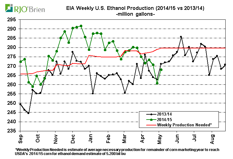 Je surveille de près la production et les stocks d’éthanol puisqu’il y a un risque évident de dévier des projections du ministère de l’agriculture pour l’année de commercialisation cours. L’EIA (Energy Information Administration http://www.eia.gov/dnav/pet/pet_pnp_wprode_s1_w.htm) rapporte une production d’éthanol de 912K barils/jour, solidement en hausse par rapport à la semaine dernière (887K), mais demeure 1% plus faible qu’à pareille date l’an dernier. Trois des dernières cinq semaines ont connu une production plus faible qu’en 2014 et ceci fait donc un énorme contraste aux 1.6% d’augmentation nécessaire d’ici le mois de septembre pour atteindre la projection de 5.2 milliard de boisseaux de maïs pour la production d’éthanol. Malgré le rebond de production de 25 millions de barils/jour cette semaine, il ne demeure pas moins que nous sommes clairement sous le rythme nécessaire de 952K à atteindre d’ici la fin de l’été. La production roule clairement sous la cible depuis six semaines et n’a rencontré le niveau hebdomadaire requis qu’une seule fois dans les douze dernières semaines. Avec l’augmentation de la demande de gazoline pour les voitures dans les mois à venir, on devrait voir la production d’éthanol bondir comme en démontre le graphique plus bas, mais de plus en plus de doute s’installe comme quoi l’augmentation de la production ne sera pas suffisante pour maintenir l’utilisation à 5.2 milliard de boisseaux. Aussi, les stocks d’éthanol qui sont actuellement assez élevés ajoute au risque que les américains iront puiser dans l’inventaire et n’auront donc pas réellement besoin de booster la production tant que ça pour suffire à la demande.