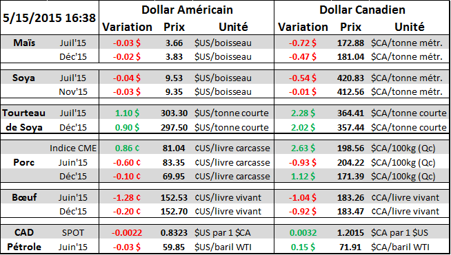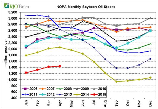 Ce midi, la NOPA a rapporté que ses membres ont triturées 150.4 millions de boisseaux de fève en avril, légèrement au-dessus de la moyenne des estimés (tableau 1 et 2). Le volume record précédent durant un mois d’avril était de 140M en 2008, nous sommes bien au-dessus de cette quantité démontrant la forte demande pour le tourteau. En apportant un ajustement pour l’ensemble des opérations de trituration américaine (la NOPA représente que 95%), la période de septembre 2014 à avril 2015 totalise une consommation de 1.266 milliard de boisseaux, en hausse de 3% par rapport l’an dernier. Selon l’USDA, la consommation annuelle de fève pour l’année commerciale serait de 1.805 milliard, il faudrait donc une hausse de 8% par rapport les niveaux de l’an dernier entre mai et août pour atteindre la cible .Il faut se rappeler que les volumes triturés l’an dernier étaient extrêmement faible à la fin de l’été en raison de la pénurie de fève, il ne serait donc pas difficile d’atteindre la cible de l’USDA, il faudrait plutôt surveiller des prochaines hausses dans les rapports mensuels de l’USDA. Les inventaires d’huile de soya demeurent faible à 1.44 milliard de livres contrairement à 2.058 milliard l’an dernier (graphique 3), il n’y a pas eu de fluctuation majeur du prix de l’huile depuis septembre 2014, oscillant autour de 0.32$/lb.