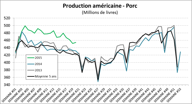 · La production hebdomadaire de porc est 5.4% et 8.1% de plus qu’en 2014 et 2013 respectivement