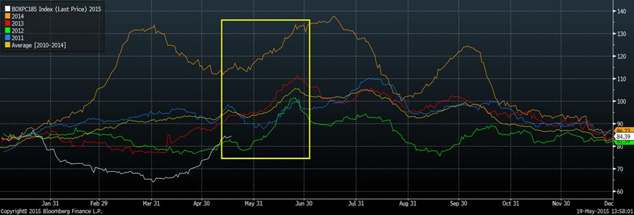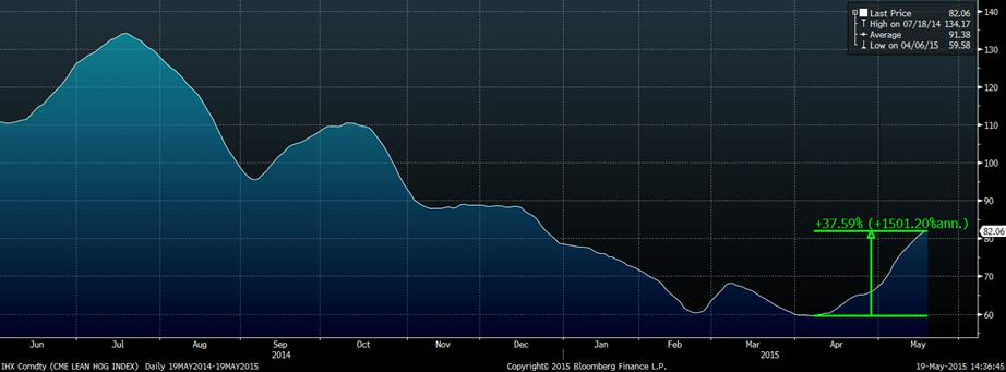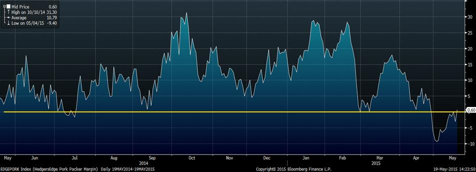 Notamment, le prix du porc découpé a tendance à augmenter durant les prochaines semaines (graphique 2) suite à la demande plus forte provenant de la consommation de chop de porc sur le BBQ. Depuis 2011, le prix de la découpe augmente en moyenne de 10¢/lb entre la mi-mai et la fin juin, ce qui amène que du positif pour la carcasse. Bien qu’on soit parti de loin, le prix de la découpe a aussi explosé ces dernières semaines. Les composantes s’étant le plus appréciées sont le jarret et le jambon avec une monté de 38% au cours du dernier mois (graphique 3). Durant la même période, on note que la valeur de la carcasse à d’avantage augmentée (+28%) que celle du porc découpé (+21%) causant une contraction de la marge des abattoirs. Après un début 2015 très profitable, les récents changements dans les prix ont causé des pertes chez les abattoirs avec une marge opérationnelle sous zéro (graphique 4) et cette marge retourne progressivement dans le positif. En considérant un retour dans la profitabilité, les abattoirs seront mieux positionnés pour enchérir les mises ce qui est aussi positif pour le prix de la carcasse.