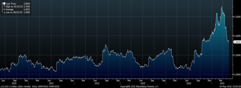· Le ratio Bœuf/Porc s’est énormément contracté, mais demeure élevé