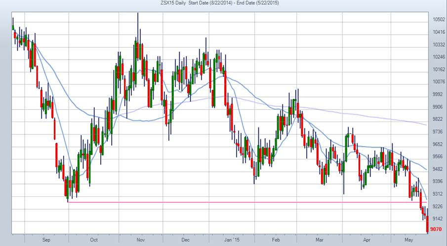 Le prix du soja glissent. Encore. En fermeture à 9.07 $/bu sur novembre 2015, on parle ici d’un nouveau bas sur le contrat. Les prix sont sous le support de l’automne passé à 927.50 et sous les moyennes mobiles 10-50-100-200 jours. On peut réellement dire que le marché à les deux pieds dans le vide…
