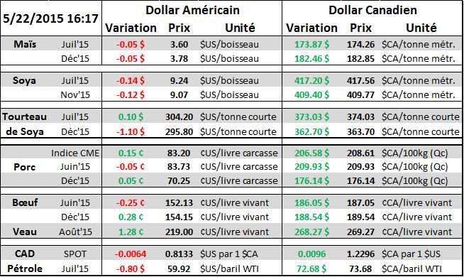 Fait à noter… l’affaiblissement du dollar canadien compense en totalité et même plus la chute des prix du grain sur CBOT. La vacances dans le Maine coûtent plus cher, mais le prix du soja en dollar canadien a augmenté malgré le recul de 14 cents du boisseaux à Chicago.