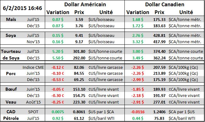 · Pas d’amélioration au niveau de la condition des cultures de maïs : le prix monte de 7¢/boisseau
