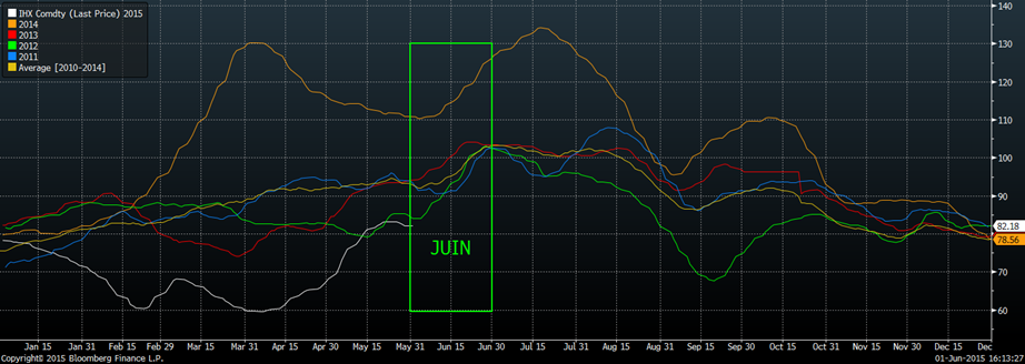 La production de viande de la 22ème semaine de l’année, incluant le congé du Memorial day, était de 395.4M livres de porc ce qui est seulement 2.1% de plus qu’en 2013. Pour une première fois depuis 20 semaines, la quantité de porcs abattus était plus faible qu’en 2013 à -0.9% (graphique 2) mais en raison du poids des carcasses à 213 lbs (graphique 3), la production reste élevée. Telles que ces dernières années, le prix cash du porc est plutôt stable après le Memorial day (graphique 4) pour ensuite continuer son ascension durant les 3 dernières semaine de juin, influencé par la forte demande liée à la fête de l’indépendance américaine (4 juillet). Comme vous pouvez voir sur le graphique, la saisonnalité est positive pour le prix pour les prochaines semaines. Après avoir légèrement diminué au cours des derniers jours, le prix cash recommencera à monter dès demain (à 82.15, +0.09¢/lb) en plus d’une valeur de porc découpé en hausse à 87.10 ¢/lb, permettant les abattoirs de maintenir une marge opérationnelle intéressante.