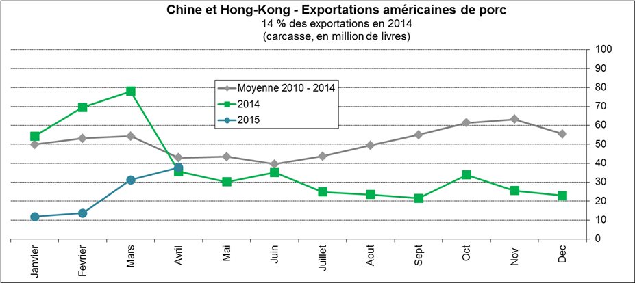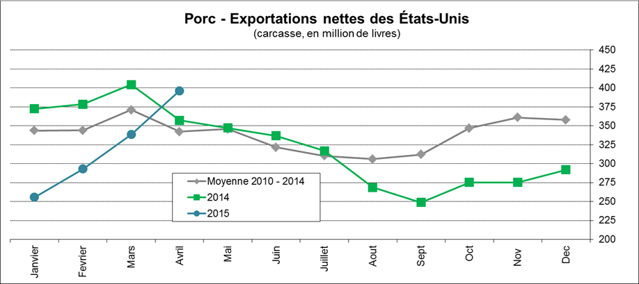 · En avril, les exportations nettes de porc étaient très fortes, à 396M livres, 11% de plus qu’en 2014