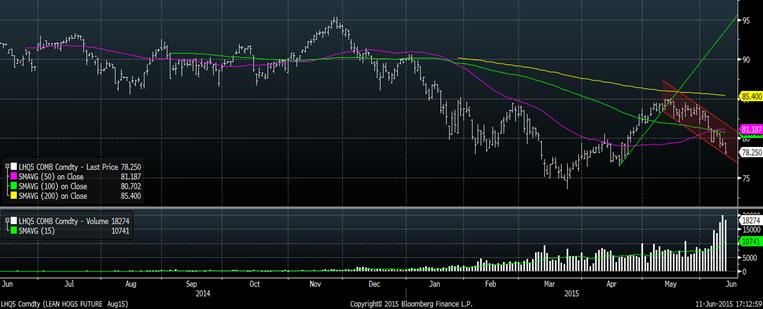 Toujours selon les projections de l’USDA, la production américaine de porc devrait se rapprocher de 2013 au cours de l’année. Avec un deuxième trimestre à 6.5% de plus que 2013, le pourcentage devrait diminuer à 4.9% et 3.6% pour le 3ème et 4ème trimestre de l’année. Nous aurons une figure plus juste sur la production porcine dans le rapport trimestriel du 26 juin, mais il reste que les prix actuels pour octobre et décembre sont 24% de moins qu’en 2013 (ajustés à l’inflation) pour un écart de production de 3.6%...