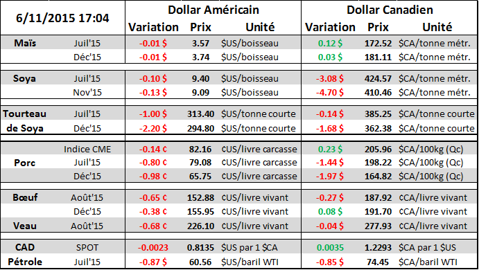 Ce matin, l’USDA dévoilait les ventes à l’exportation de la semaine dernière qui étaient plus fortes que prévues pour la fève soya avec 553K tonnes combinant l’ancienne et la nouvelle récolte (graphique 1). Il y a toujours des ventes de soya sur l’ancienne récolte mais l’USDA n’a pas augmenté ses estimés hier pour la demande extérieure de fève. Concernant les ventes de maïs, on était dans le bas des estimés avec 611K tonnes, principalement pour l’ancienne récolte. Finalement, les ventes de blé étaient dans le haut des estimés à 376.7K tonnes, toutes pour la nouvelle récolte. Notez que les cadrans ont été remis à zéro pour le blé puisque nous commençons l’année commerciale 2015/16. L’ensemble du prix des grains était négatif aujourd’hui suite au rapport « offre et demande » d’hier dévoilant une plus grosse production en Amérique du Sud.