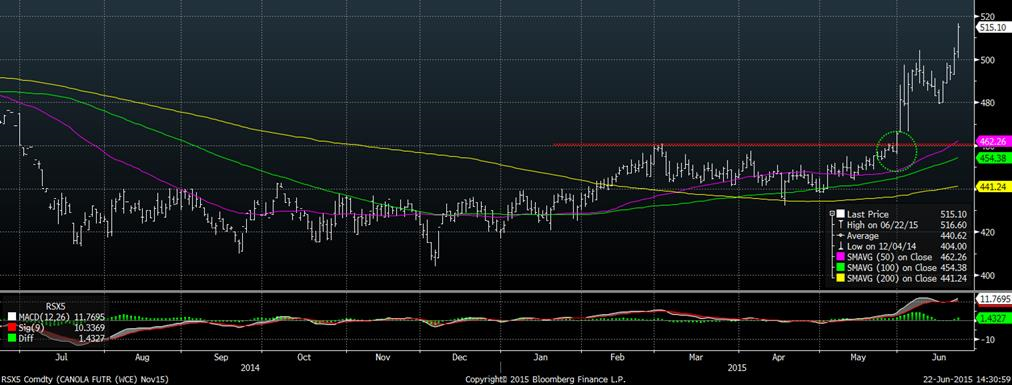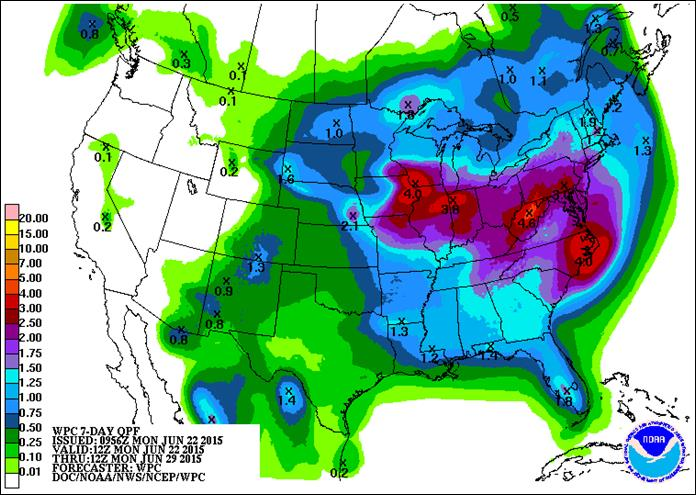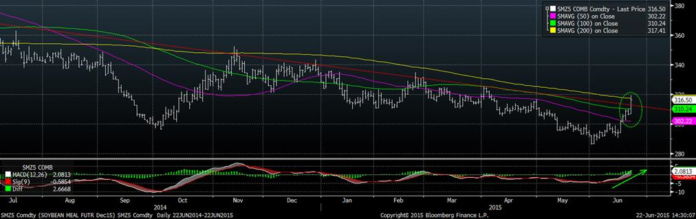Le prix des grains a monté de 2 à 3% aujourd’hui en raison d’incertitudes météo qui pourraient endommager les récoltes américaines et retarder la finition des semis de fève. À la lumière du rapport sur la progression des récoltes, ces craintes étaient fondées! D’une part, les surplus d’eau des dernières semaines ont fait réduire la qualité du maïs et du soya, avec 2% des superficies qui ont été déclassées de « bien et excellent » pour les 2 cultures. Désormais, 71% du maïs est considéré en bonne condition, soit 3% de moins que l’an dernier à pareille date. Pour la fève, il y a 65% des cultures en bonne état ce qui est 7% de moins qu’en 2014. D’autre part, le passage de la tempête tropicale Bill a empêché la progression des semis de soya, passant de 87% à seulement 90% complété, comparativement à 95% en moyenne. Nous avons plus que perdu l’avance d’une semaine qu’avait les producteurs américains sur l’échéancier normal en début de saison. Il y a certains États qui sont seulement à 80% ensemencés, dont le Kentucky, Kansas, Tennessee et la Caroline du Nord, sans oublié le Missouri à 51% complété. En sommes, on parle de plus de 8M acres a semé prochainement et les prévisions météo démontre encore de la pluie sur ces États durant les prochaines semaines (graphique 1). C’est ce qui inquiète le marché et fait augmenté le prix de la fève. Le prix du tourteau a augmenté de 20$US/tonne courte à Chicago depuis 5 jours (graphique 2) et a brisé la résistance descendante aujourd’hui pour terminer la journée sur la moyenne 200 jours, en hausse de 10$. Du côté du canola canadien, on a fait un nouveau haut aujourd’hui à 515 $CA/tonne à Winnipeg (graphique 3) suite au gel au sol durant la première fin de semaine de juin au Manitoba, le prix a augmenté de 13% en 3 semaines. Le tourteau de canola ne sera pas à rabais, ce qui met de la pression haussière sur la protéine végétale, . Dans les deux céréales oléagineuses, le MADC nous indique un momentum positif et la structure à terme est en backwardation, il y a donc un réel risque de voir le prix des tourteaux augmenter d’avantage.