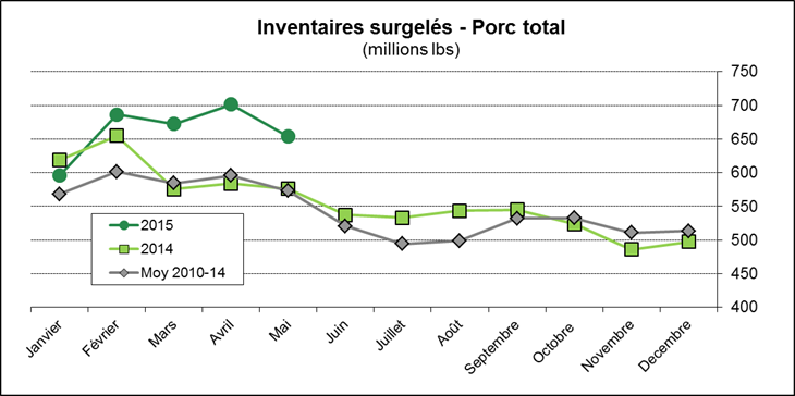 · Inventaires surgelés de porc : 13.5% de plus qu’en mai 2014, à 653.6 M livres