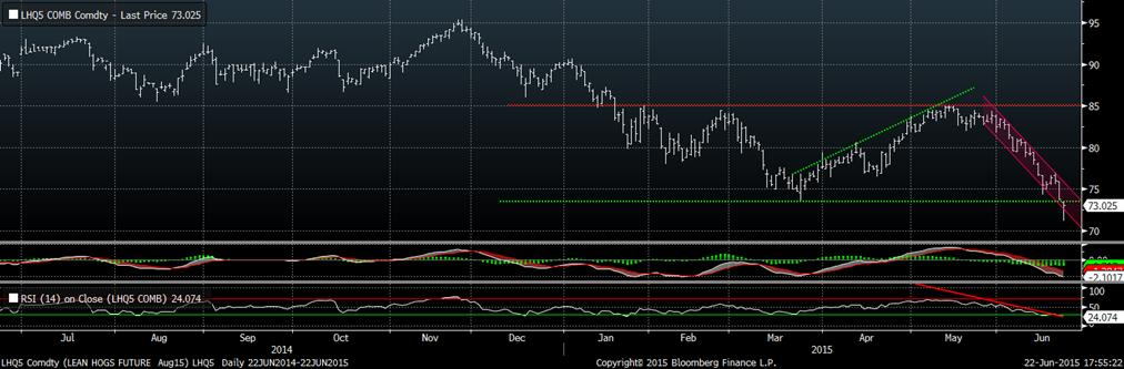 À 16h00, l’USDA publiait le rapport mensuel sur les inventaires surgelés où on note une augmentation de 13.5% des inventaires de porc comparativement à mai 2014 (graphique 4). Ce matin, le prix du porc avait ouvert en panique, à la baisse de quasiment 3¢/lb sur le mois d’août, pour terminer la journée en baisse de seulement 0.4 ¢/lb. Puisqu’on faisait de nouveaux bas sur les contrats à terme (graphique 5), il y avait probablement plusieurs ordres stop qui ont été déclenchés l’un à la suite de l’autre, expliquant la sur-réaction du prix en matinée. De retour aux inventaires surgelés, ils demeurent toujours élevés dans le porc et rappelons-nous que la production du mois de mai n’était pas si énorme relativement aux années passées, contrairement à la production du mois de juin... Nous pourrions donc voir des inventaires surgelés plus élevés à la fin du mois de juin. Néanmoins, les inventaires de retailles de porc ont chuté de 22% en mai, pour aller rejoindre la moyenne 5 ans… est-ce que les chinois ont d’avantage acheté durant le mois de mai ? Les chiffres d’exportation sortiront le 8 juillet. Par ailleurs, les inventaires surgelés de bœuf sont stables et continuent d’être supérieurs à l’an dernier, de l’ordre de 24% pour le mois de mai (graphique 6).