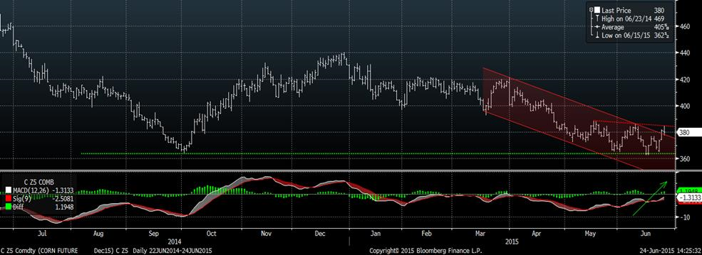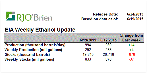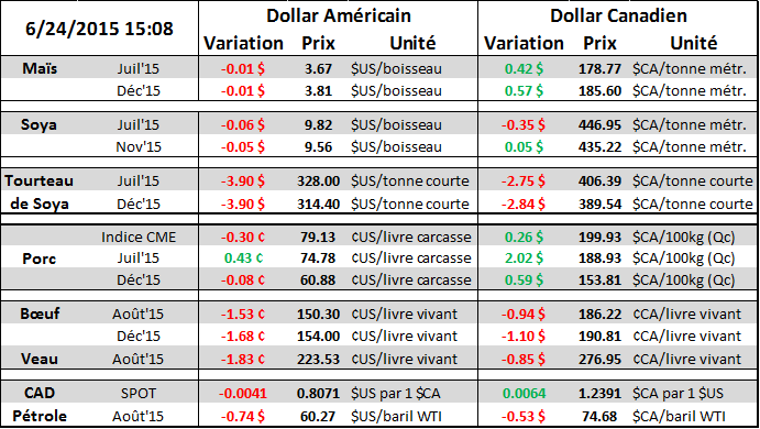 Premièrement, bonne Saint-Jean ! Malgré que ce soit notre fête nationale, le marché boursier à Chicago était ouvert. Le prix du maïs a fait un nouveau haut à 3.84 ¾ depuis 2 semaines, avant de reculer face à la résistance au même niveau (graphique 1). La bonne nouvelle de la journée fût la production record d’éthanol durant la semaine dernière, à 994,000 barils par jour, en plus que les inventaires ont chuté de 0.88M barils à 19.84M (tableau 2). Présentement, il faudra une production hebdomadaire de 952 380 barils par jour pour rencontrer les prévisions de l’USDA ce qui risque d’être relativement facile en autant que la marge opérationnelle reste positive, actuellement à 0.19$/gallon pour les livraisons de juillet.