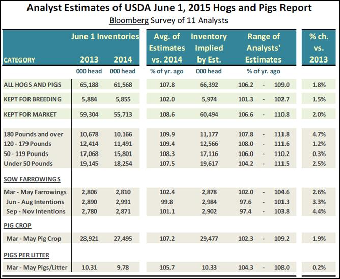 La firme Bloomberg a publié les estimés de 11 analystes sur le rapport Hogs and Pigs de vendredi prochain. Selon la moyenne des estimés, au 1er juin, l’inventaire total de porcs vivants était 7.8% de plus qu’en 2014, mais seulement 1.8% de plus qu’en 2013 (tableau 3). Le cheptel commercial serait 8.6% de plus que l’an dernier mais 2.0% de plus qu’il y a deux ans, avant que la production soit perturbée par la DEP. Les analystes prévoient des inventaires de porcs de plus de 180 lbs à 9.9% plus élevés que l’an dernier alors que les abattages actuels roulent à 11.3% de plus depuis 3 semaines. La classe de poids entre 120 et 179 lbs serait 1.2% de plus qu’en 2013 (abattages de la mi-juillet à fin août), si on ajoute 3% pour le poids des carcasses, on pourrait s’attendre à une production entre 4 et 5% de plus qu’en 2013. Cependant, le prix du contrat d’août est à 72 ¢/lb comparativement à 94 ¢/lb en août 2013. Selon Steve Meyer, le prix des contrats à terme reflète des attentes de production bien plus élevés que ceux dévoilé dans les estimés du rapport. Pour les abattages de fin août à mi-octobre (50 à 119 lbs), on s’attend à seulement 0.3% plus de cochon qu’en 2013, ce qui est plutôt en ligne avec les dernières prévisions de l’USDA si on considère une carcasse plus pesante.