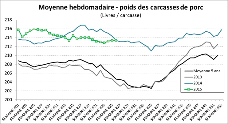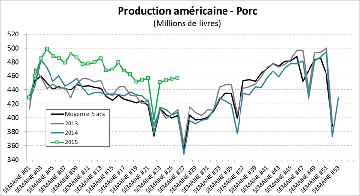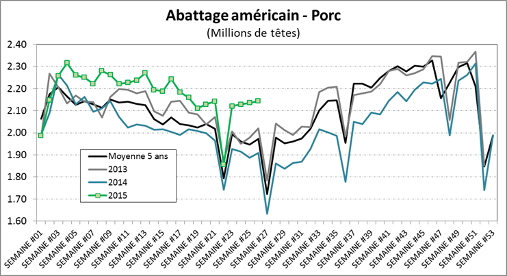 · La production hebdomadaire de porc est 12.2% de plus qu’en 2014 et 11.1% de plus qu’en 2013