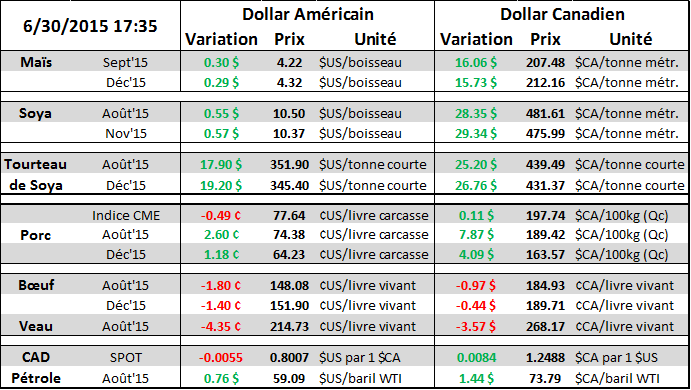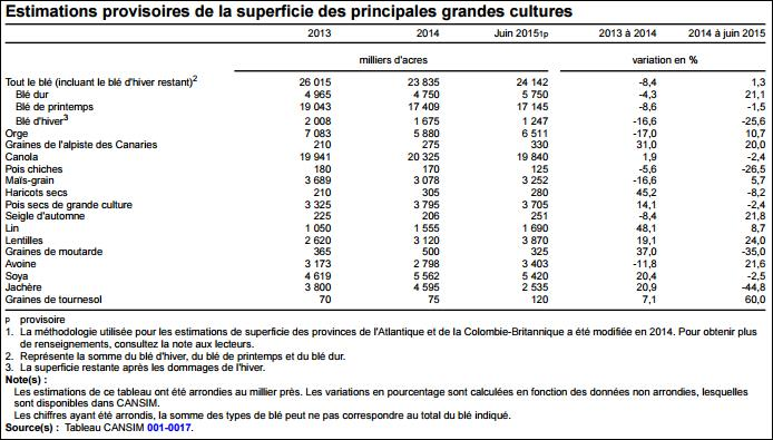 Au Canada, nous avions également la publication des superficies des différents cultures (Tableau 6). Dans le blé canadien, les superficies sont estimées à 24.1M d’acres, une hausse de 1.3% par rapport 2014.Les superficies pour le blé de printemps sont évaluées à 17.15M acres ce qui est -4.8% que les intentions de mars. Pour la culture du Canola, les producteurs ont déclaré avoir ensemencé 19.8M acres cette année, pour une baisse de 2.4% comparativement à 2014, mais une hausse de 2.2% comparativement aux intentions du printemps. Dans la fève soya, à l’échelle nationale, la superficie ensemencée s’établirait à 5.4M d’acres, représentant une diminution de 2.5% par rapport les superficies records en 2014 mais une hausse de 0.8% versus les intentions. Au Québec, la superficie ensemencée en soya a diminué de 9.5% pour s’établir à 778 400 acres, inchangée depuis le rapport des intentions de mars. Concernant le maïs-grain, il devrait y avoir 3.3M acres d’ensemencées, pour une hausse de 5.7% versus 2014 mais 0.5% de moins qu’en mars. Au Québec, la superficie plantée de maïs a augmenté de 2.8% relativement à 2014, pour atteindre 901 900 acres. Cependant, c’est 50,700 acres de moins (-5.3%) que les intentions d’ensemencement de mars dernier. Finalement, les superficies canadiennes dédiées à la culture d’avoine est 6.6% plus faible que lors des intentions de mars, atteignant 3.4M acres.