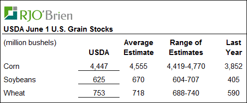 C’était une journée mouvementée aujourd’hui avec une hausse de plusieurs pourcents sur le prix des grains, causée par un rapport positif pour les prix et des craintes reliées aux conditions météo. D’une part, le rapport de l’USDA sur les inventaires au 1er juin a démontré une forte demande durant le 3ème trimestre de l’année commerciale, avec des réserves plus faibles que prévues (tableau 1). Pour les inventaires de maïs, c’était à 4.45 milliards de boisseaux ce qui est 2.4% moindre qu’anticipés ce qui est évidemment positif pour le prix, en hausse de 7%, atteignant la limite quotidienne de 30¢/boisseau. Concernant les inventaires de fèves, elles étaient à 625M de boisseaux au 1er juin, soit 6.7% de moins que la moyenne des estimés, également positif pour le prix. Dans le blé, c’était l’opposé avec plus de grains que prévu avec 753M boisseaux ce qui n’a pas empêché le prix d’augmenter.