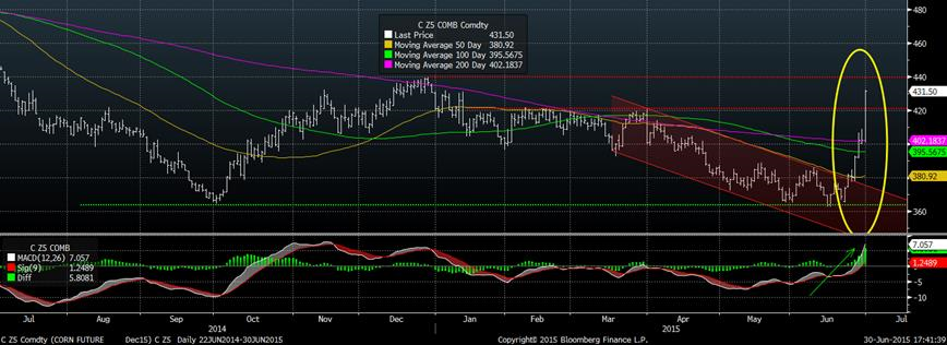 Forcément, toutes ces nouvelles, combinées avec la détérioration de la condition des cultures publiée hier soir, ont incité les acheteurs à se manifester sur les marchés lesquels étaient plutôt passifs ce printemps. De plus, les spéculateurs détenaient une position vendeur dans le complexe céréalier, causant un effet boule-de-neige sur les achats de grains. Reuters rapporte que les fonds de spéculation ont acheté, aujourd’hui seulement, 40K contrats de soya, 25K de maïs, 17K de blé et 12K de tourteau. Présentement, le momentum et la tendance sont haussier sur le prix du maïs (graphique 4) et du soya (graphique 5). Nous avons traversé plusieurs résistances assez facilement et si les craintes persistent au niveau des cultures américaines, cette nouvelle tendance pourrait bien continuer.