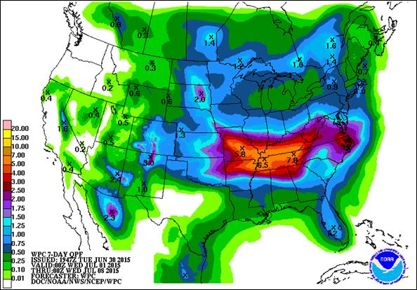 Image 3 – Prévision des précipitations durant les prochains 7 jours (en pouce)