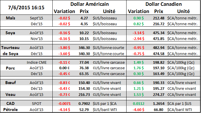 Après une pause de 3 jours, le marché des grains a ouvert fortement à la baisse. À vrai dire, ce sont la majorité des matières premières qui était dans le rouge aujourd’hui, après que la Grèce ait voté « non » au plan d’austérité proposé par ses créanciers, en plus du crash boursier en Chine mettant tous deux de l’incertitude au niveau de l’économie mondiale. Le plus gros perdant de la journée a été le prix du pétrole, en baisse de 7.3% à 52.79 $US/baril. En raison de ces 2 évènements (incertitude économique et chute du pétrole), le taux CAD/USD a touché son plus bas niveau depuis avril, à 0.789. Le prochain support est à 0.78 et ensuite, ce sera le plus bas niveau depuis 2009.