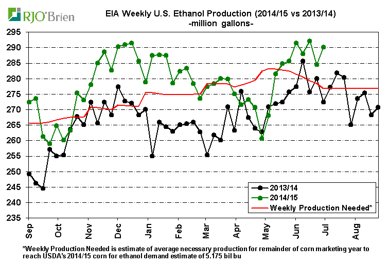 La mise à jour hebdomadaire des données reliées à l’éthanol montre un regain de la production au-dessus des niveaux requis pour atteindre la cible d’utilisation de mais fixé par l’USDA. Ça fait six semaines que la prod roule à environ 385-390 millions de gallons par semaine alors que l’USDA n’aurait besoin qu’environ 377M pour respecter les projections d’utilisation. Donc basé sur ces données des récentes semaines il serait fort probable de revoir le ministère de l’agriculture remonter l’utilisation de 25 millions de boisseaux lors du prochain rapport. En fait cela ne ferait qu’annuler la baisse qu’ils ont inscrit le mois passé. Voir tableau et graphique plus bas.