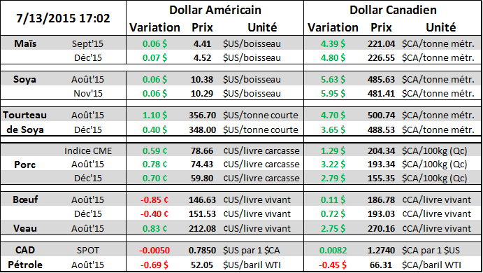 Pour un troisième jour consécutif, le prix du maïs fait un nouveau sommet à 4.52 $US/boisseau (graphique 1), propulsé par le résultat du rapport de vendredi démontrant une baisse des inventaires pour la prochaine récolte, sans ajustement sur le rendement. La tendance haussière des 3 dernières semaines se poursuit et l’analyse technique est en faveur d’une continuation de la tendance. Pour un acheteur n’ayant rien de fermé, l’achat d’une police d’assurance (expiration octobre) est de mise… il est un peu tard pour fermer le prix mais le risque haussier persiste. Malgré les inquiétudes du marché, la condition de la cultures de maïs reste bonne, à 69% de bien et excellent, ce qui est nettement mieux que la moyenne de la dernière décennie, même si c’est moins bon que l’an dernier (graphique 2). Concernant le soya, la condition suit la moyenne 10 ans en baisse de 1% avec 62% de la récolte en bonne ou excellente posture (graphique 3). On note que 4% du soya n’a toujours pas sortie des terres alors qu’en moyenne, 100% des surfaces ont émergées. Plusieurs estiment qu’au moins un million d’acres pourraient ne pas être ensemencés au Missouri seulement, à cela s’ajouterait les régions voisines.