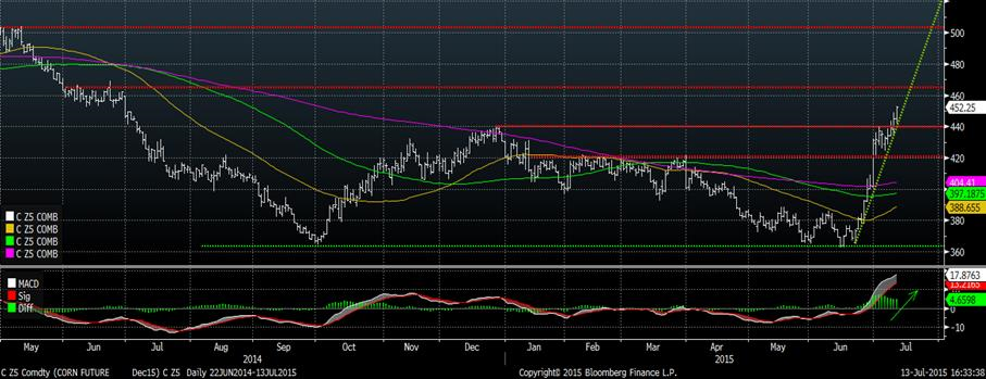 Graphique 1 - Prix du maïs décembre 2015 ¢us/boisseau