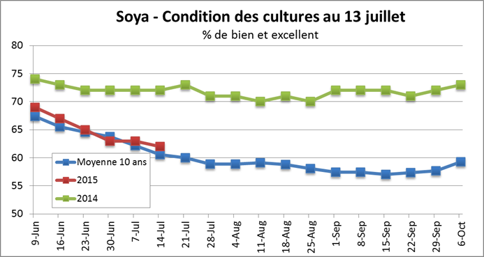 · Soya : détérioration de 1% de la condition à 62%