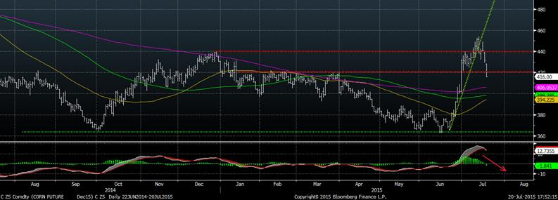 Un autre facteur à considérer mais plus subtile : le % d’acréage récolté. On a vu d’énormes précipitations innondant des champs ce qui pourraient faire en sorte que ces surfaces ne soient pas récoltées bien qu’elles ont été ensemencées. Il n’y aura pas de donnée sur l’acréage par la FSA avant le mois d’août, mais 4 États sont à surveiller (par importance) : Illinois, Indiana, Ohio et Missouri. On parle qu’environ 600,000 acres pourraient ne pas être récoltés en raison des innondations ce qui diminuerait le taux récolté de 2.5% par rapport la normale. À l’inverse, on parle de rendement record en Iowa (12 tonnes/hectare), le plus gros État producteur de maïs représentant 15% des surfaces américaines. Également, les rendements devraient être bon au Nebraska et au Minnesota lesquels sont les 3ème et 4ème plus gros État producteur et connaîtront probablement une production supérieure à 2014. Dans l’ensemble, plusieurs spécialistes estiment que le rendement américain de maïs se situerait entre 163 et 166 boisseaux/acre, comparativement à 171 boisseaux/acre l’an dernier. Avec un rendement de 165, on pourrait s’attendre à ce que le prix moyen du maïs se siturait entre 3.85 et 4.55 $/boisseau. toujours selon les mêmes analystes.