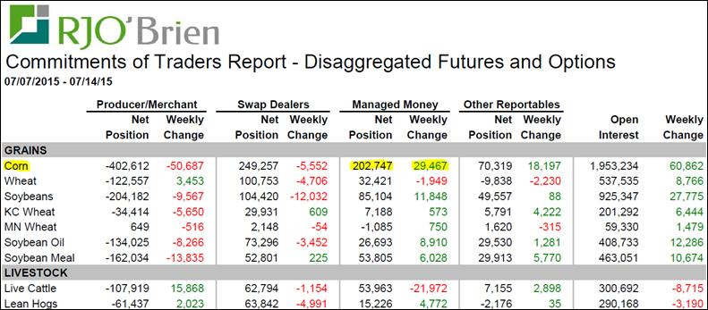 À très court terme, le prix du maïs semble beaucoup plus faible que le soya, s’ayant transigé sur son support à 4.21 $/boisseau pendant une bonne partie de la journée avant de subir une 2ème vague de vente, terminant la séance à 4.16$ (graphique 1). En plus d’avoir ouvert avec un « gap » à la baisse, nous avons brisé le support et le momentum est désormais vers la baisse. On peut penser que le violent mouvement d’aujourd’hui est en partie causé par un retrait des fonds spéculateurs dans le marché des grains, lesquels avaient accumulé une position de +202 700 contrats en date du 14 juillet, soit 30 000 de plus que la semaine précédente (tableau 2). La baisse pourrait continuer ces prochains jours puisque d’une part, les producteurs tenteront de sécuriser des prix au-dessus du coût de production avant qu’il ne soit trop tard, parce que les acheteurs pourraient rester patient face aux prévisions météo favorables pour le pollinisation en plus des fonds de spéculation qui pourraient se retirer du marché. La semaine dernière, les spéculateurs ont été moins actifs dans les autres marchés à l’exception du bœuf où ils ont liquidé 22 000 contrats.