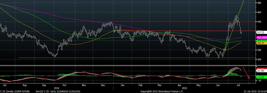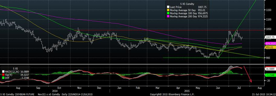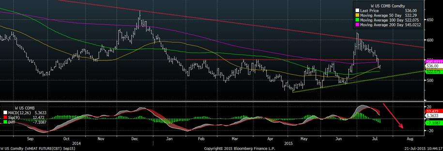 Depuis la brisure de la tendance haussière le 7 juillet, le prix semble plafonner et a perdu son momentum haussier. De plus, on note un « double-top » sur la résistance de 10.44 $/boisseau qui est définitivement le prochain niveau à traverser avant de dire que le prix du soya pourrait poursuivre son rallie. Néanmoins, la moyenne mobile 50 jours croisera bientôt la moyenne 100 jours, nous sortirons donc de le tendance baissière de long terme, contrairement au maïs.