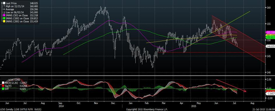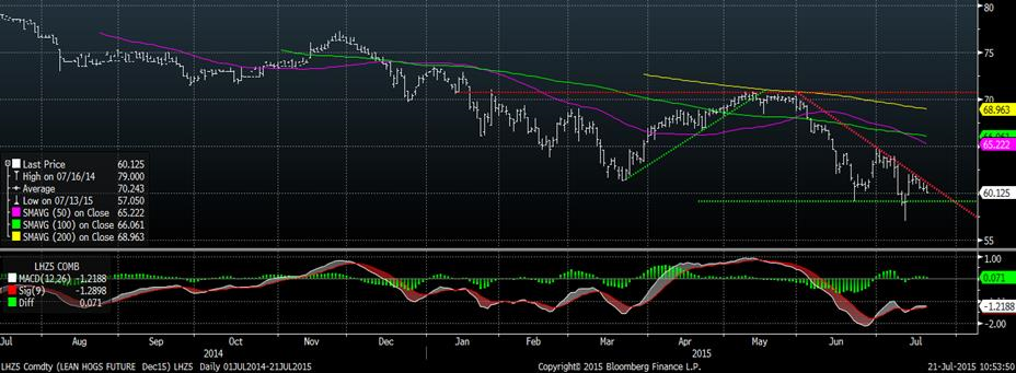 Depuis la chandelle de renversement du 13 juillet, ayant fait un nouveau bas, le prix du porc a beaucoup de difficulté à percer les nombreuses résistances. Pour le prix de décembre, on parle d’un triangle descendant ce qui pourrait s’avérer négatif si on ne réussi pas à percer la résistance d’ici la fin du mois. À l’exception du contrat août, le momentum semble neutre, on est en attente du prochain mouvement majeur afin de définir la direction d’une tendance future.