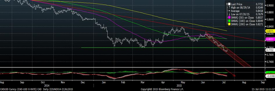 Depuis l’annonce de la baisse du taux d’intérêt au Canada, le taux a brisé le support à 78.00 et continue son chemin dans le canal baissier. La moyenne mobile 50 jours est de retour sous la moyenne mobile 100 jours, confirmant la tendance baissière sur le long terme. Il n’y a plus vraiment de support au niveau actuel, outre le creux de 2009 à 76.54 CAD/USD. Après ce niveau, nous serions au plus faible taux depuis 2004. Puisque le canal baissier est assez étroit et qu’il y a désormais une résistance à 78.00, on peut se permettre d’attendre un changement de tendance avant d’acheter.