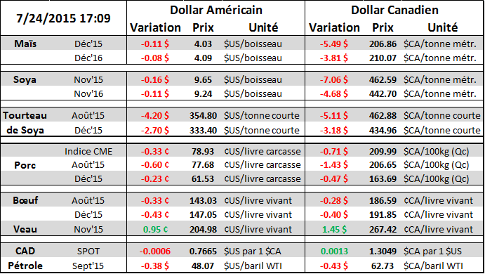 Entre le 15 et 21 juillet, le prix du maïs a baissé de 5% soit 21 ¼ ¢/boisseau. Plusieurs suspectaient que les spéculateurs se retiraient du marché alors que ce n’était pas le cas. Au contraire, ils ont augmenté leur exposition de 77 000 contrats de maïs pour atteindre 279 655 contrats ce qui est la plus grosse position depuis décembre 2012! Donc, la pression baissière de la semaine dernière ne provenait même pas des fonds de spéculation. On pourrait s’attendre à ce qu’ils liquident leur position tôt ou tard ce qui pourrait causer une exagération à la baisse du prix du maïs. Rappelons-nous que l’an dernier, nous faisions face à la plus grosse récolte américain ce qui n’avait pas empêché les prix de remonter à 4.00 $/boisseau durant l’hiver, alors que nous sommes à ce niveau actuellement et que la récolte 2015/16 s’annonce inférieure de quelques pourcents par rapport l’an dernier. De plus, pendant la même période, les spéculateurs ont acheté 5 000 contrats de fève et 7 400 contrats de tourteau, pour un total de 90 200 et 61 200 contrats respectivement. Seul le blé n’a pas su les attirer puisqu’ils ont liquidé le tiers de leur position, de retour avec 20 600 contrats achetés.
