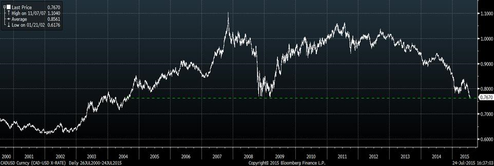 Ce matin, le dollar canadien a touché son plus bas niveau depuis septembre 2004 (graphique 3) à 0.7635 $US par $CA ou 1.31 $CA par $US. Autrement dit, les voyages dans le Maine couteront 31% de plus qu’il y a 3 ans alors que le taux de change était à la parité. Depuis l’annonce de la baisse du taux directeur au Canada, le dollar canadien a terminé seulement une journée dans le vert, pendant que la tendance baissière continue. Les prochains chiffres économiques importants à suivre seront le PIB canadien le 31 juillet et celui des États-Unis le 30 juillet, en plus de la décision des taux d’intérêt aux États-Unis le 29 juillet lesquels devraient restés inchangés.