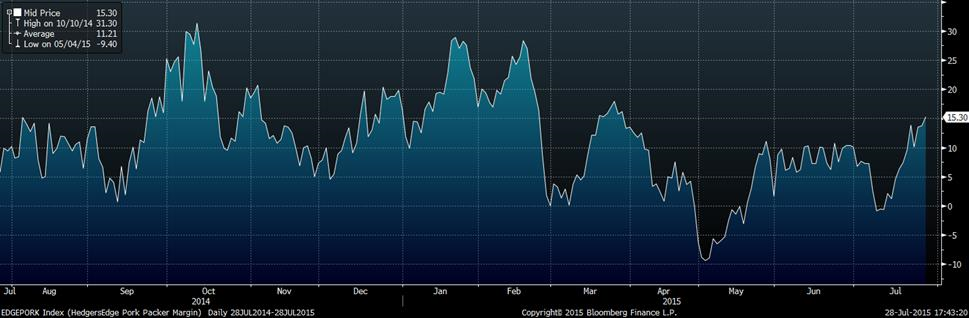· La marge des abattoirs est à un sommet de 4 mois, à 15$US/tête