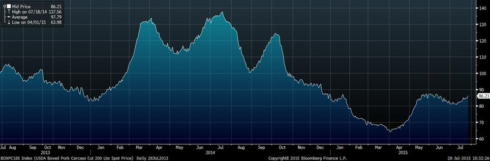 La demande ne semble pas seulement avoir du bon potentiel outremers, également en Amérique du Nord. Récemment, plusieurs chaînes de restauration américain ont dévoilé leur changement de menu afin d’inclurent plus de porc en raison du faible prix. D’une part, il y a McDonald avec un menu déjeuner 24hrs pour stimuler la vente de saucisses; Garza’s Chicago Q restaurant qui ont ajouté 6 nouveaux items avec du bacon et pulled-pork; Wendy’s Co. a ajouté l’extra de bacon frit (et oui, du bacon frit!); Potbelly Corp. a lancé un nouveau sandwich au pulled-pork; et Papa John’s ajoute du bacon sur sa pizza double cheeseburger. Bref, les américains ajoutent plus de bacon et de pulled-pork à leur gastronomie. Ceci démontre bien l’effet de substitution entre le prix du bœuf et du porc à moyen terme : contraintes à satisfaire l’appétit du consommateur sans augmenter leur prix, les chaînes de restauration se retournent vers le porc qui est nettement moins cher que le bœuf. L’effet de substitution ne se fait pas instantanément puisqu’il y a des coûts à changer un menu et l’approvisionnement, mais lorsque l’écart de prix persiste durant plusieurs mois, la demande pour la viande la moins chère augmente.