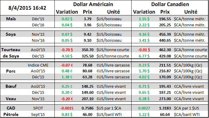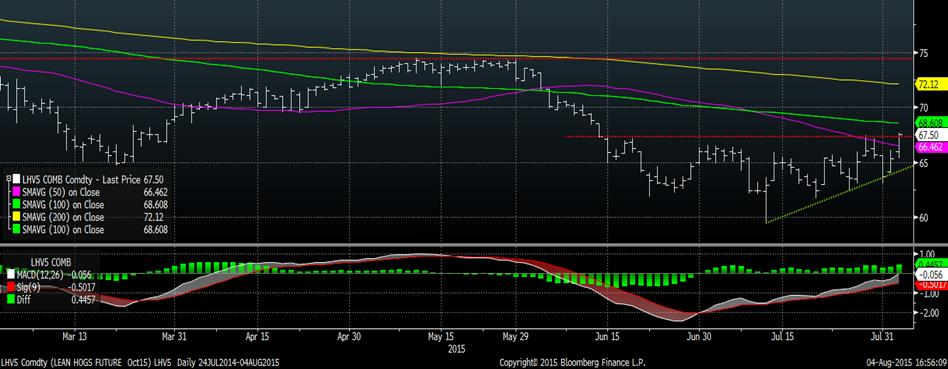 Malgré le statuquo du prix cash, le prix du porc découpé continue son ascension après un sommet de 7 mois. Au plaisir des abattoirs dont la marge a explosé à 19.5 $US/porc en date d’hier, le prix du porc découpé est rendu à 88.57 ¢/lb alors que le prix cash demeure dans la zone des 79¢/lb. Depuis 4 jours, le prix du jambon (25% de la carcasse) a augmenté de 14%, maintenant à 64.25 ¢/lb. Aussi, le prix du bacon supporte également l’augmentation du prix de la carcasse avec un gain de 5.75% depuis le 29 juillet. Ce sont les 2 principales coupes qui aident à la profitabilité des abattoirs et devraient avoir tôt ou tard une répercussion positive sur le prix cash. Bien que le prix du contrat d’août n’ait pas vraiment monté, ceux pour le reste de 2015 ont gagné de 2 à 3% aujourd’hui. Le contrat de décembre n’a toujours pas percé sa résistance à 65¢/lb, mais le mois d’octobre a fermé juste au-dessus à 67.60 (graphique 1). Si ce niveau est brisé, la prochaine résistance est à 74.50 ¢/lb ce qui donnerait 200$CA / 100kg au taux de change d’aujourd’hui.