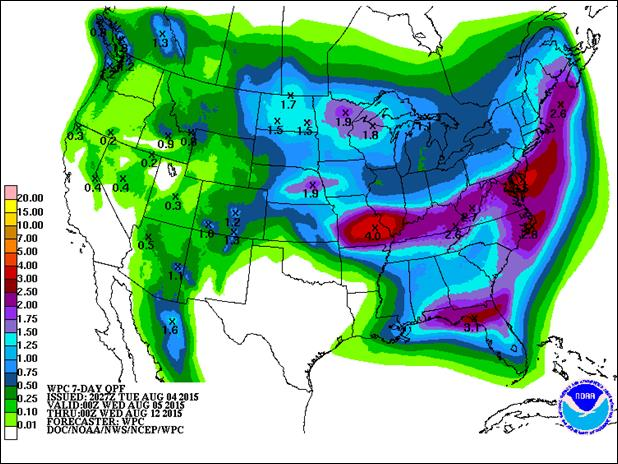 En ce moment, le plus pertinent du côté des grains est de voir la valse des estimés de rendement qui commencera à sortir avant le rapport officiel de l’USDA le 12 août, particulièrement ceux de FC Stone et Informa Economics. On s’attend à des rendements autour de 165 boisseaux (USDA juillet à 166.8) à l’acre pour le blé d’Inde et 45 dans le soja (USDA juillet à 46.0), mais des ajustements au niveau des surfaces est toujours possibles, à suivre… La météo apportera des précipitations sur le Midwest, plus en abondance au Missouri et dans le sud de l’Illinois (graphique 2). Par contre, les prévisions 8-14 jours montrent des températures et précipitations un peu plus haut qu’à la normale.
