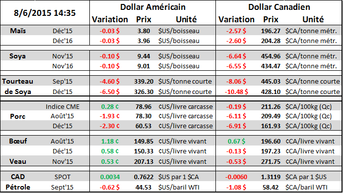 Ce matin, l’attention était dirigée vers les ventes à l’exportation de grains puisqu’il y a un retard dans le carnet de commande pour l’an prochain (graphique 1) et que certains doutent que les américains réussiront à vendre autant de grains que l’an dernier après l’appréciation du $US. Dans le soya, il y a 447 300 tonnes qui a été transférées de l’ancienne récolte à la nouvelle en plus de 576 900 tonnes qui se sont ajoutées aux commandes déjà existantes. Toutefois, cet ajout est loin de combler le retard dans les ventes de soya, à seulement 19% de la cible de l’USDA alors que nous sommes normalement au-dessus de 35% à cette période de l’année. Dans le maïs, les ventes de la semaine dernière étaient décevantes à seulement 274 300 tonnes, bien en-dessous des anticipations. Les ventes conclues jusqu’à maintenant représentent seulement 9.6% de la cible de l’USDA, contre 15 à 20% normalement. Notez que le retard des ventes est moins « stressant » dans le maïs où les exportations représentent que 10% de la demande contre 60% dans le soya (tourteau et huile incluent). Au moins, les ventes de blé sont venues sauver le complexe des grains avec un volume plus du double des estimés, à 840 800 tonnes. Conséquemment, le prix du blé est le seul à voir terminé la journée dans le vert.