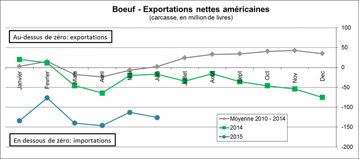 Toujours dans les échanges internationaux, l’USDA publiait aujourd’hui les exportations de viande pour le mois de juin. Dans le porc, les États-Unis ont vendu 413 M livres, mais ont acheté 95.5 M livres pour des exportations nettes de 317.5 M lbs (graphique 2). Le volume net vendu en juin était similaire à la moyenne quinquennale, mais 5.7% en dessous de juin 2014. On note de fortes achats au Mexique (graphique 3) qui ont été compensés par des achat au Canada (graphique 4). La Chine n’a toujours pas commencé a importé des États-Unis (graphique 5) dont les volumes achetés sont similaires aux années précédentes. Dans le bœuf, les États-Unis ont eu recours à l’Australie et la Nouvelle-Zélande pour combler sa demande bovine, avec 216 M livres achetées en provenance de l’Océanie. Les importations nettes de bœuf étaient de 125.7 M lbs ce qui est similaire au reste de 2015 (graphique 6).