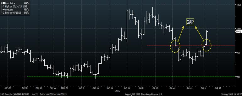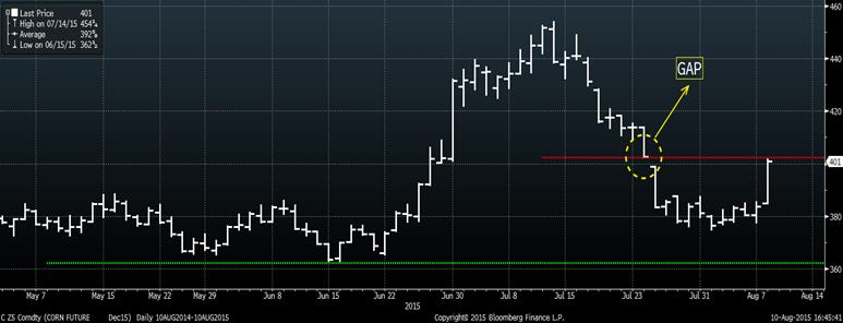 Plusieurs s’attendaient à une hausse du prix des grains, mais peut-être pas aussi rapidement. Les prix du maïs et du soya ont augmenté de 16¢/boisseau et 31¢/boisseau respectivement, la hausse s’est faite progressivement tout au long de la journée. La situation est d’avantage positive pour le soya lequel a couvert le « gap » formé il y a 2 semaines (graphique 1) en plus d’avoir formé un autre « gap » à l’ouverture ce qui est normalement positif pour le prix. Dans le maïs, malgré le gain de 4.3% d’aujourd’hui, nous n’avons toujours pas couvert le « gap » d’il y a 2 semaines (graphique 2), nous sommes juste en-dessous ce qui constitue la résistance à court terme. Fort probablement, ce mouvement provenait d’acheteur en vue du rapport de mercredi prochain et n’est qu’un ajustement pour amener le prix plus près de l’équilibre. Tel que précisé dernièrement, un rendement de 165 boisseaux/acre correspond statistiquement à un prix d’environ 4.20 $US/boisseau compte tenu de l’acréage actuel.