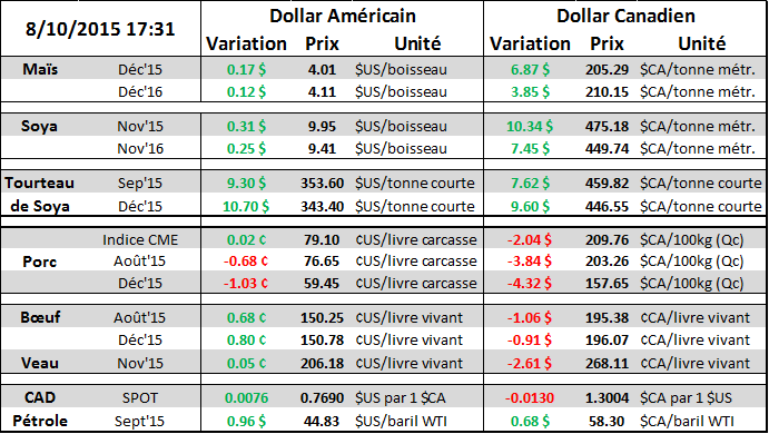 · Augmentation du prix du maïs de 4.3% et du soya de 3.5%
