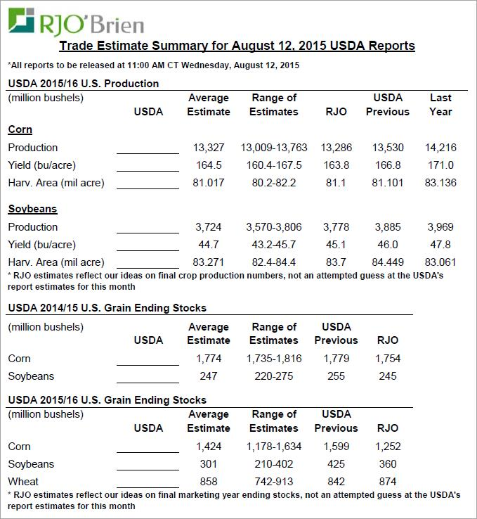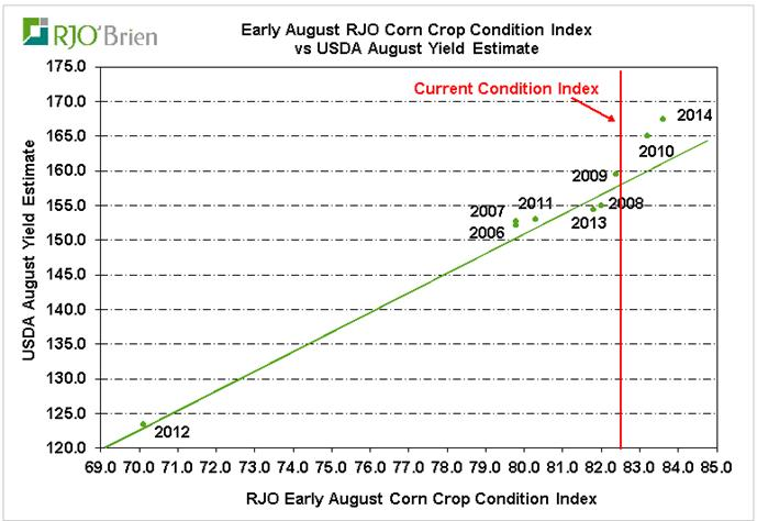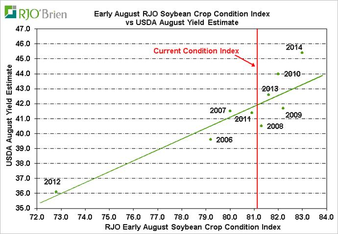 La semaine dernière, le département de recherche de R.J. O’Brien à Chicago a publié une étude sur la relation entre le rendement et la condition des cultures. Depuis 2006, la relation est assez forte ce qui nous permet d’estimer le rendement du maïs et du soya selon le résultat des dernières années. En créant un indice basé sur la condition des cultures en août, on note une relation linéaire avec le rendement publié dans le rapport de l’USDA en août (et non le rendement final). Selon les conditions actuelles et la relation empirique, on pourrait s’attendre à un rendement de 158 boisseaux/acre pour le maïs (graphique 3) et 42 boisseaux/acre pour le soya (graphique 4). Actuellement, les prévisions pour le rendement de mercredi (tableau 5) sont bien plus élevés ce qui plausible, mais il y aurait plus de « chance » de voir une donnée inférieure aux attentes que de les surpasser.