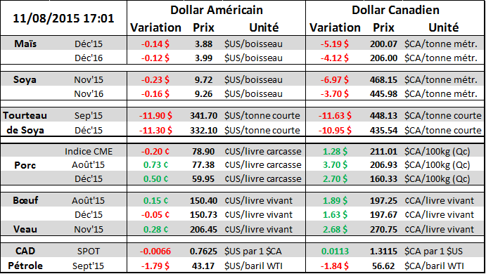 Journée très négative sur les marchés agricoles aujourd’hui si bien que presque toute la hausse d’hier dans le grain a été effacée durant la journée. Le marché est toujours en mode attente du rapport de demain où nous pourrons mettre à jour les prévisions sur la production américaine de céréales. Les analystes s’attendent à un rendement en légère baisse dans le maïs (164.5) et le soja (44.7). Le rapport sort demain à midi pile.