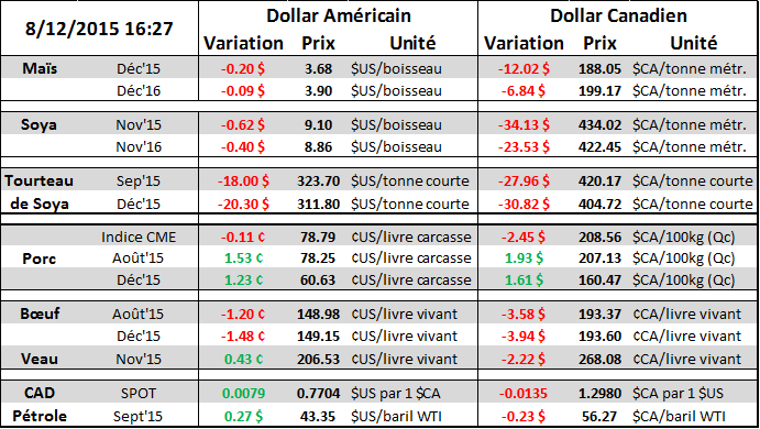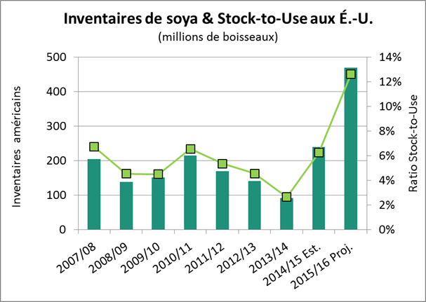 L’onde de choc est arrivé quand les rendements ont été affiché en hausse de 2 boisseaux à l’acre pour atteindre 168.8 alors que le marché s’attendait à une légère baisse par rapport au « trendline » de 166.8. La majorité des analystes prévoyaient un rendement moyen de 164.5. Puisque le gouvernement américain laisse intacte les superficies, la révision des rendements augmente de 114 millions de boisseaux l’inventaire de fin 2015/16 pour atteindre 1.713 milliard. Par rapport à un rendement de 164.50, la nouvelle vient de rajouter plus de 325 millions de boisseaux dans le marché! C’est majeur. Par contre je tiens à souligner que l’USDA demeure cohérente avec les statistiques qu’elle publie chaque lundi sur la progression et la qualité des cultures. En date du 9 aout, dernière donnée disponible, 70% du mais était de bonne ou d’excellente condition. Par comparaison l’an passé sur le rendement record de 171 boisseau à l’acre les mêmes conditions étaient à 73%. Au final on sait que les champs sont très variables d’un état à l’autre et avec la projection actuelle de 168.8, il y a donc peu de place pour une augmentation supplémentaire dans les mois à venir. Au niveau de la demande, elle demeure stable avec de légères modifications ; +25M dans le feed, +25M dans l’éthanol et -25M dans l’export. Au total dans toutes les catégorie d’utilisation la demande est plus forte de 40 millions de boisseaux. Coté mondial c’est aussi le même constat avec la deuxième récolte au Brésil (safrinha) revue en hausse de 2 millions de tonnes.